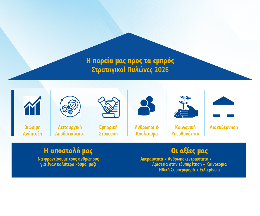 Σε αυτούς τους πυλώνες βασίζεται κάθε μας απόφαση και πρωτοβουλία. Είναι η κοινή μας πυξίδα, που διασφαλίζει ότι κινούμαστε με συνέπεια και υπευθυνότητα προς την επίτευξη των στόχων μας.