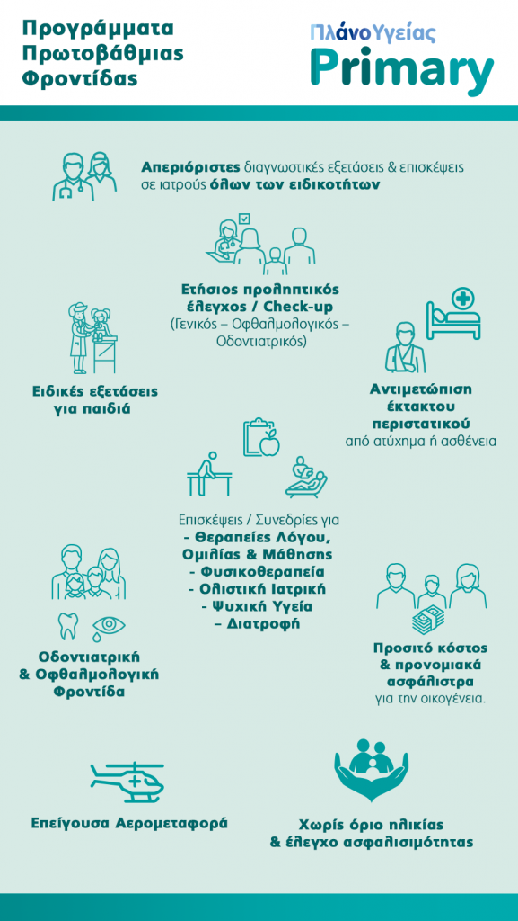 Δείτε κάποια από τα ιδιαίτερα πλεονεκτήματα που προσφέρουν τα νέα προγράμματα «Πλάνο Υγείας» για την οικογένεια και ελάτε να σχεδιάσουμε μαζί το οικογενειακό συμβόλαιο που ανταποκρίνεται στις δικές σας ανάγκες.